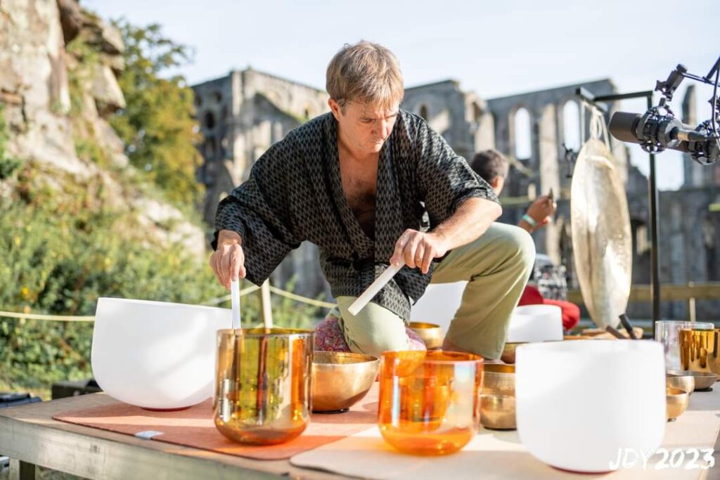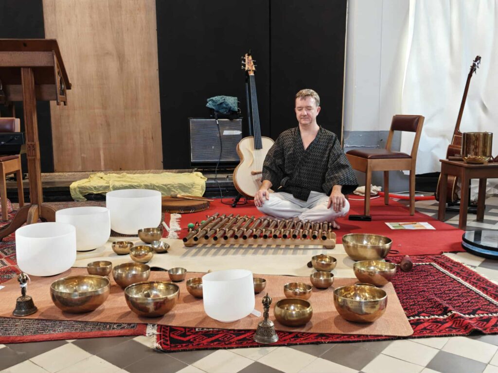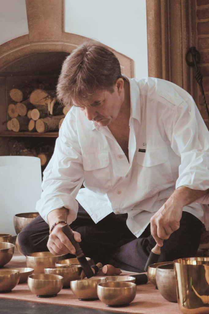 Sa quête d’équilibre trouve un ancrage puissant dans le Yoga, une pratique quotidienne qu’il vit comme un éveil permanent. C’est cependant sa rencontre avec les bols chantants qui parachève son approche: subjugué par leur impact immédiat sur le bien-être, il décide alors d’investiguer et de partager cette médecine du son.
