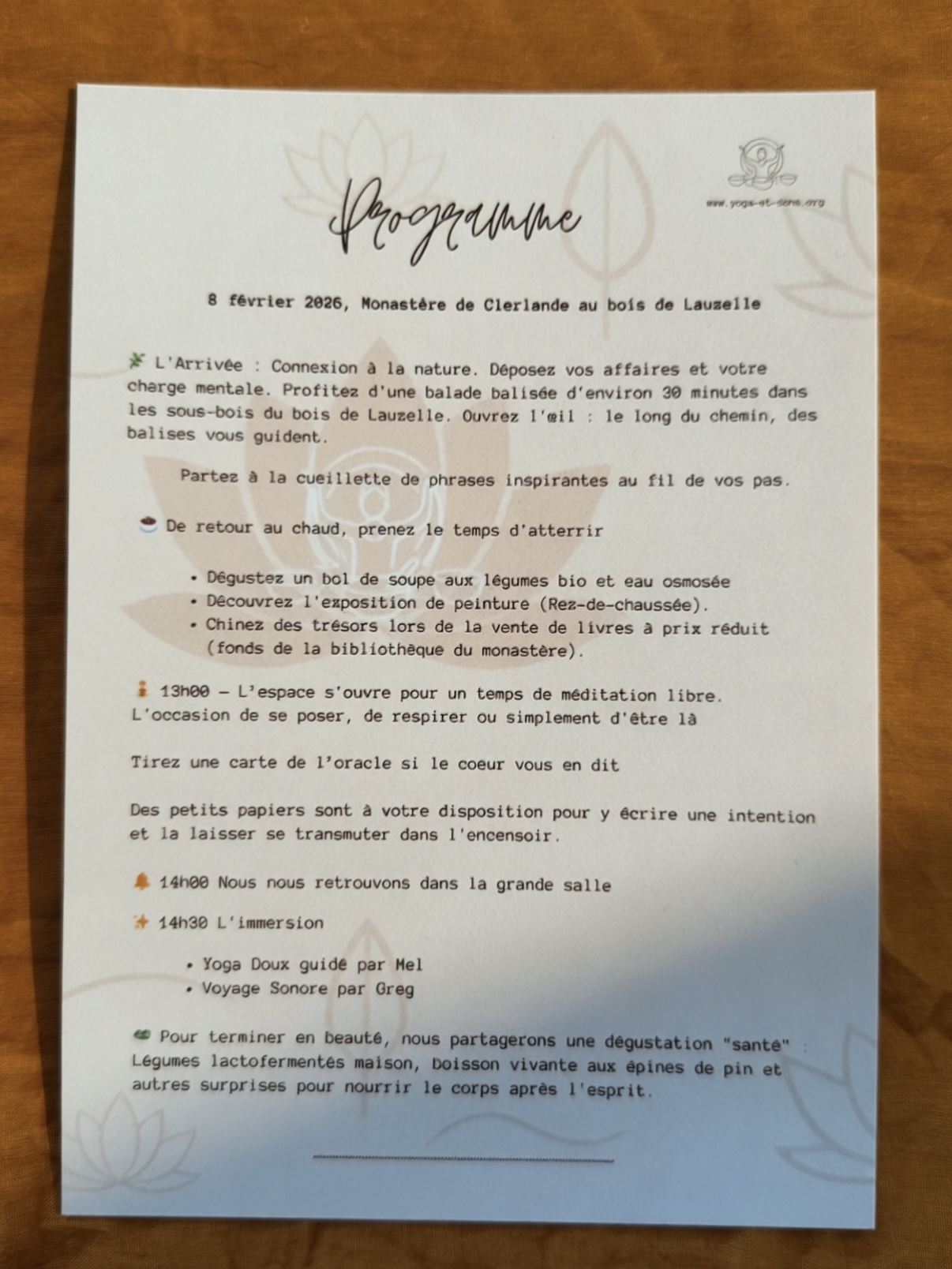 10h45 | Accueil Pour les participants à la journée complète, nous vous accueillons au Monastère de Clerlande dès le matin. Arrivée en douceur, installation, infusion chaude et temps d’ancrage dans le lieu.